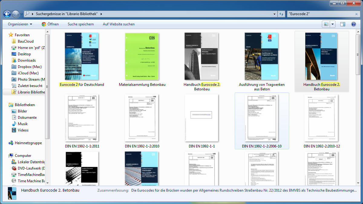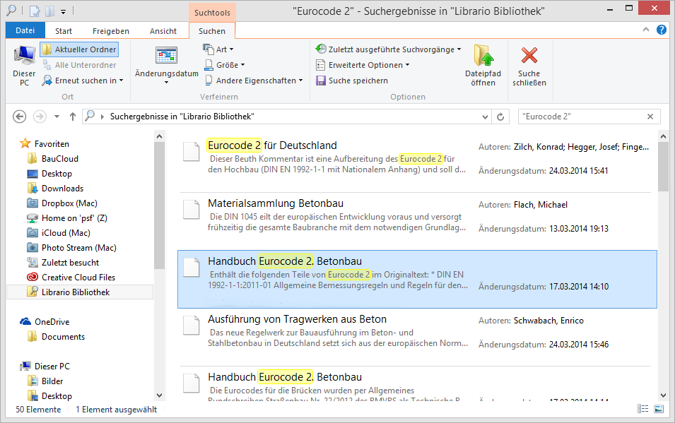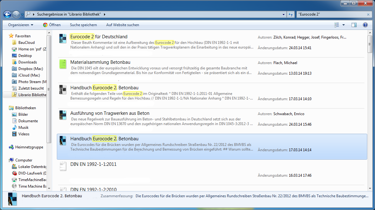 Verwenden Sie zur Suche das Suchfeld an der rechten Seite. Die Ergebnisse werden wie ganz normale Dateien angezeigt. Sogar mit Vorschaubild – und wie unten im Bild ersichtlich – den wichtigsten Literaturangaben. Mit einem Klick auf ein Ergebnis wird die Publikation in Ihrer Librario-Bibliothek geöffnet.