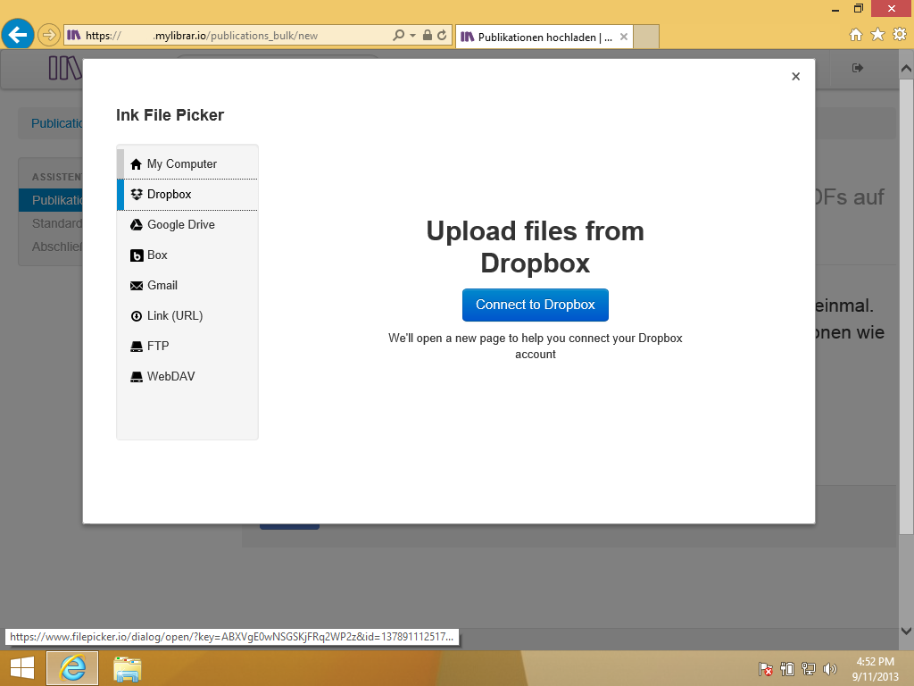 Beschleunigen Sie das Hochladen Ihrer PDFs indem Sie die Daten zum Beispiel von Dropbox, Google Drive oder FTP importieren.